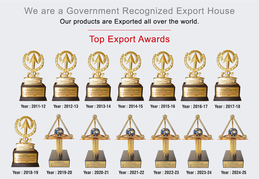 We are proud of the awards & recognition we’ve received from The Plastics Export Promotion Council (popularly known as PLEXCONCIL) sponsored by the Ministry of Commerce & Industry, Department of Commerce,